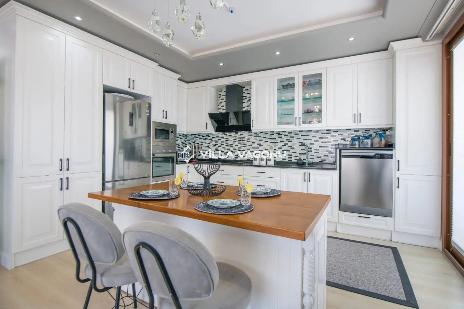 Muhteşem manzaraya karşı, güneşlenip yüzebileceğiniz havuz terasında kapasiteye uygun şezlong takımı, oturma grubu, barbekü alanı bulunan villanın, yine havuz terasına açılan konforlu oturma odası ve tam donanımlı açık mutfağı; birinci yatak odasında çift kişilik yatak, ebeveyn banyosu, ikinci yatak odasında iki adet tek kişilik yatak, üçüncü yatak odasında çift kişilik yatak ve banyo bulunmaktadır.
