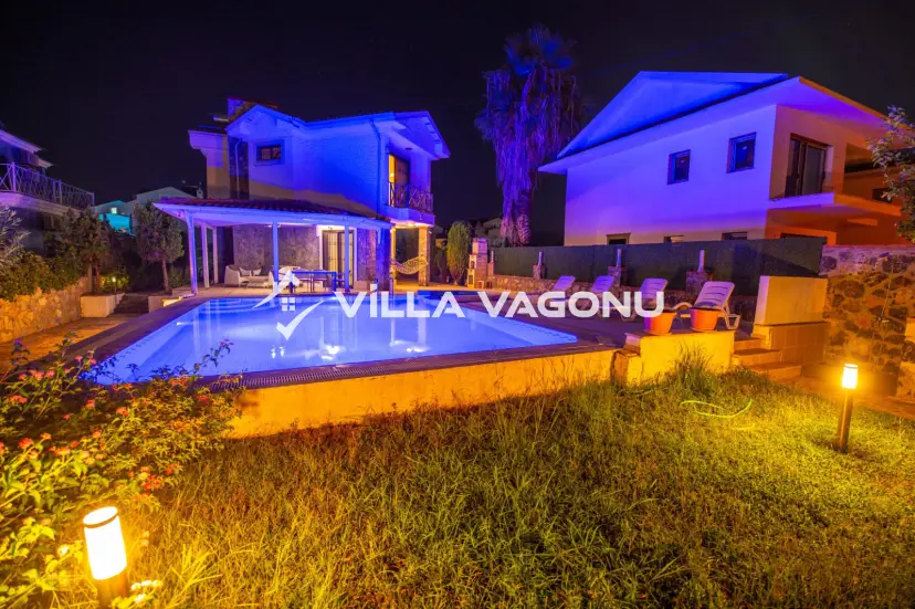 Fethiye Çalış mevkiinde bulunan villada 3 yatak odasıyla 6 kişi konaklama imkanı bulunmaktadır. Plaja yakın mesafede özel havuz bahçe alanına sahip olup, kalabalık ailelere ve hücresel hücreler için idealdir.