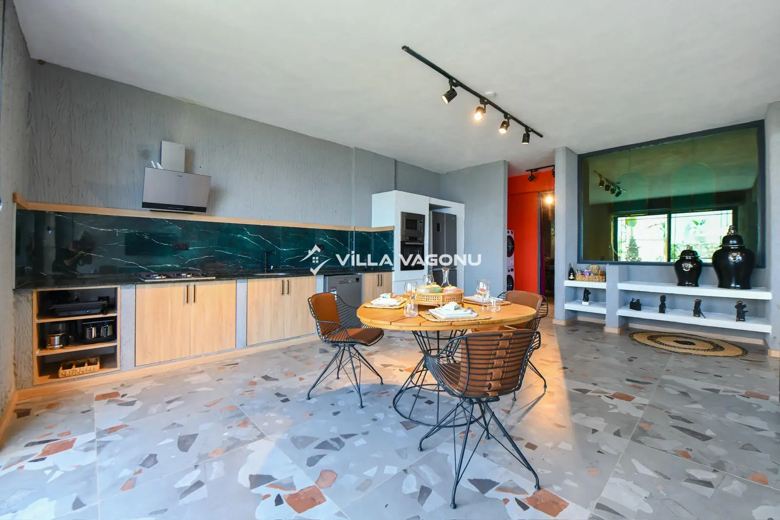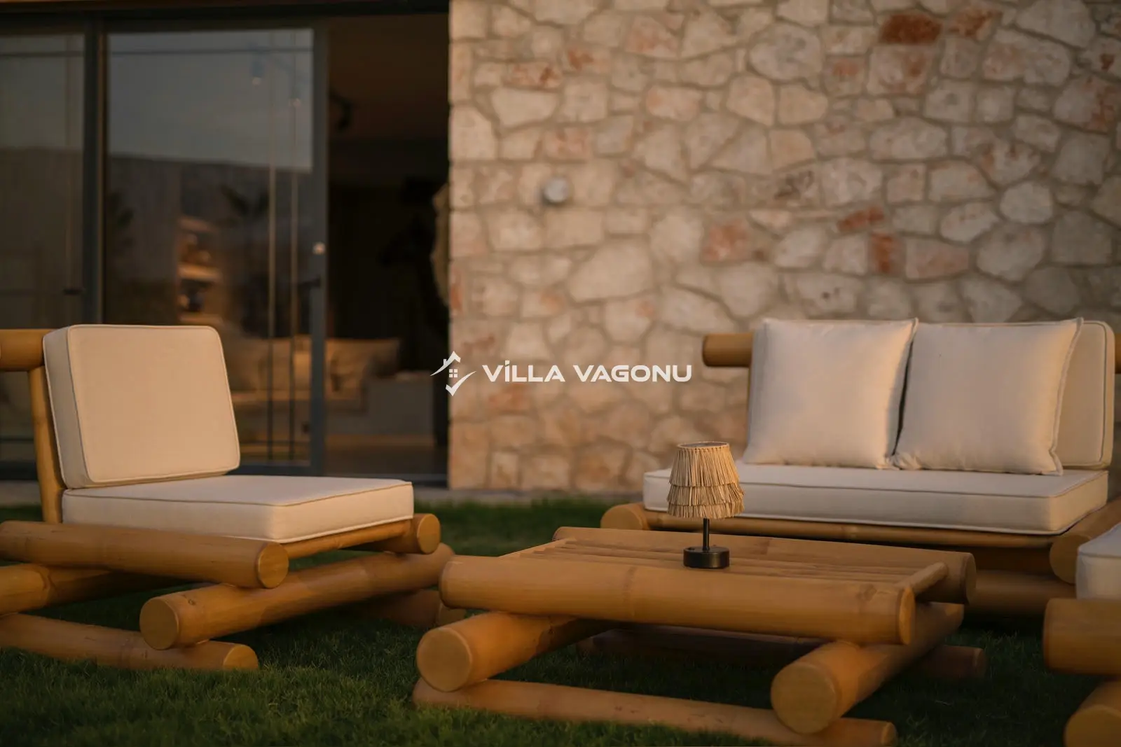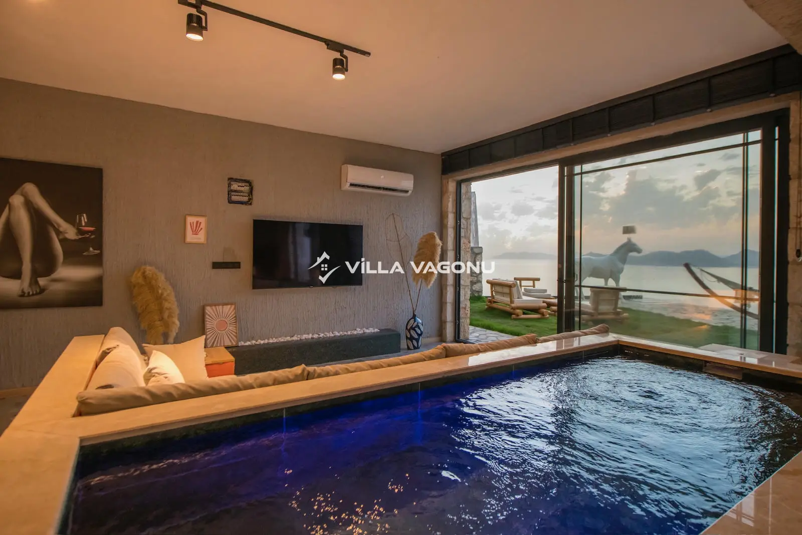 Villamızın özel havuzunda doyasıya yüzebilir ve güneşin keyfini çıkarabilirsiniz. Bahçe alanında kapasiteye uygun şezlong takımı, oturma grubu ve barbekü bulunmaktadır. Havuz terasına açılan konforlu oturma odası ve tam donanımlı açık mutfak, tatilinizi daha da keyifli hale getirecek. Villamızın birinci yatak odasında çift kişilik yatak, ebeveyn banyosu ve jakuzi yer almaktadır.