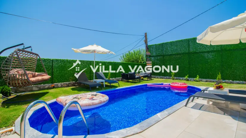 Villamızın özel havuzunda doyasıya yüzebilir ve güneşin keyfini çıkarabilirsiniz. Bahçe alanında kapasiteye uygun şezlong takımı, oturma grubu ve barbekü bulunmaktadır. Havuz terasına açılan konforlu oturma odası ve tam donanımlı açık mutfak, tatilinizi daha da keyifli hale getirecek. Villamızın birinci yatak odasında çift kişilik yatak, ebeveyn banyosu ve jakuzi; ikinci yatak odasında ise iki adet tek kişilik yatak ve banyo yer almaktadır.